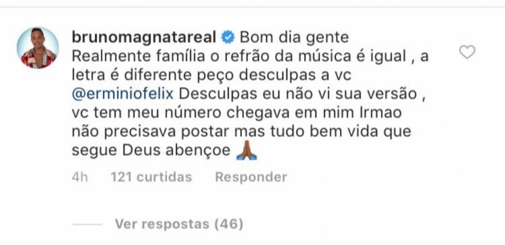 O Bahia Notícias tentou contato com o cantor Bruno Magnata, mas não obteve resposta até o fechamento da nova. Contudo, mais tarde, o próprio vocalista da La Furia deixou um comentário na postagem de Erminio. "Bom dia, gente. Realmente família, o refrão da música é igual. A letra é diferente. Peço desculpas a você, Erminio Feliz. Desculpas, eu não vi sua versão. Você tem meu número, chegava a mim, irmão. Não precisava postar, mas tudo bem. Vida que segue. Deus abençoe". Ao ver o recado, Erminio, então, gravou um vídeo sobre todo o caso. "Ah, mas a versão de La Furia está melhor que a sua. É a mesma coisa que você querer comparar a ro** de Kidbengala com a de Brad Pitt. A de Brad é mais bonita, mas a minha é preta e grande, por**. Eu tenho humildade, caralho. O que custa uma ligar?", questionou.