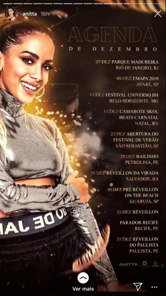 O show da cantora Anitta no Festival Virada Salvador será no dia 29 de dezembro. Apesar do mistério da prefeitura da cidade sobre a grade de cada dia de festa, a cantora divulgou a agenda do mês de dezembro nas redes sociais e revelou o dia que vai animar o público presente na Arena Daniela Mercury, na Orla da Boca do Rio, na capital.