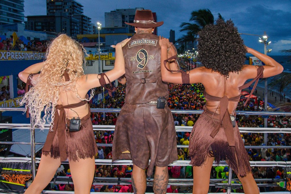 Conhecido pelo desempenho no palco e pelas coreografias que dominam as redes sociais, Léo Santana apresentou um repertório que incluiu as apostas para o título de música do Carnaval 2026, além de sucessos consolidados de sua carreira solo. O avanço do trio pela Barra foi marcado pela interatividade do cantor com o público.